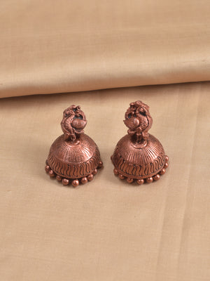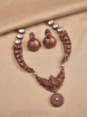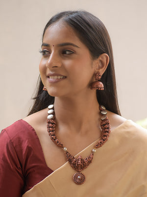 Tamralakshmi - Handcrafted Copper-Finish Terracotta Temple Necklace Set with Goddess Lakshmi & Peacock Motifs and Matching Earrings