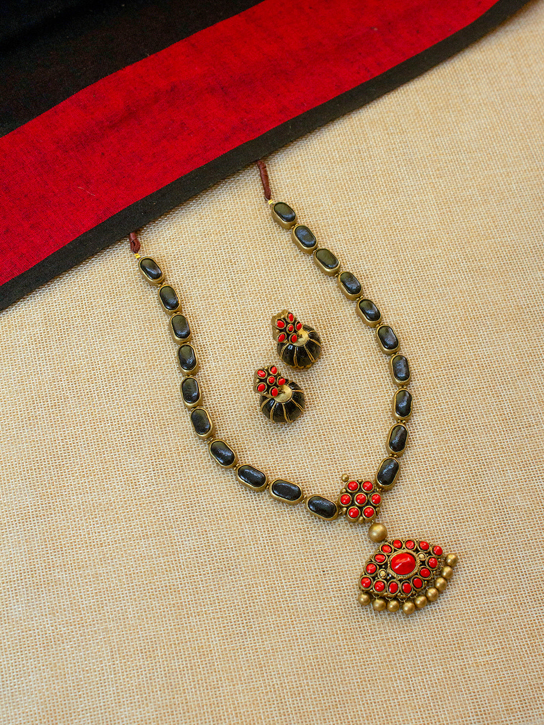 Handcrafted Floral Terracotta Jewellery Set in Black, Red & Antique Gold
