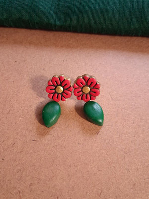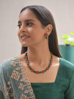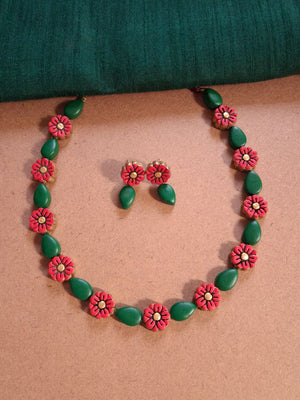 Handcrafted Floral Terracotta Necklace & Earring Set – Forest Green and Crimson