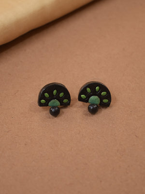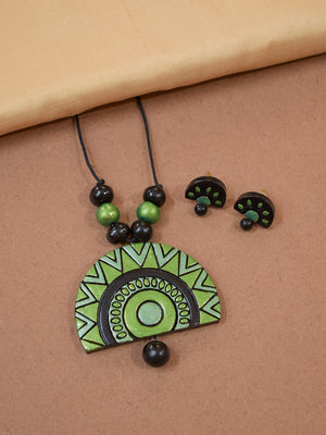 Handcrafted Green Color Terracotta Necklace with Tribal Inspired Half-Circle Design and Stud Earrings