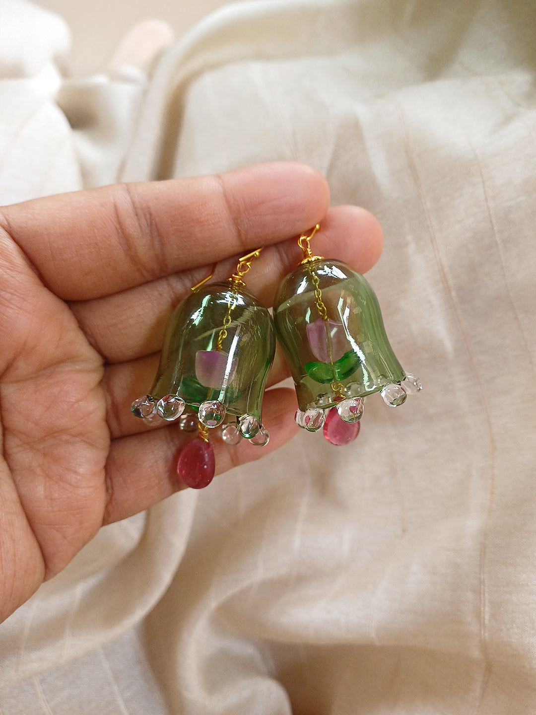 Handcrafted Green Glass Bell-Shaped Floral Earrings with Bead Drops
