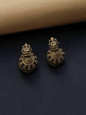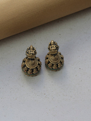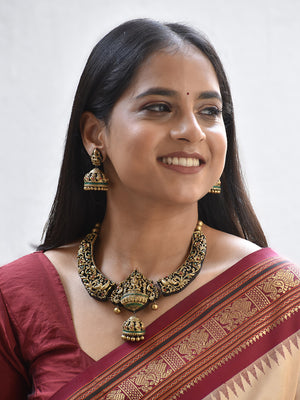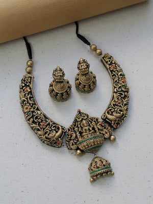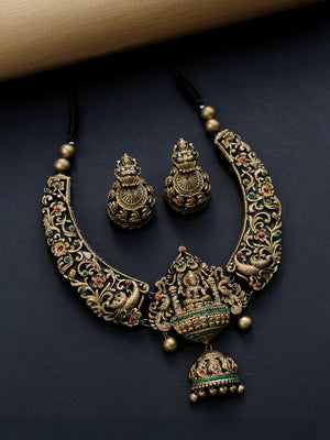 Handcrafted Lakshmi Pendant Temple Jewellery Set in Antique Gold with Red & Green Accents
