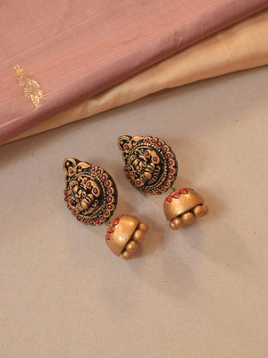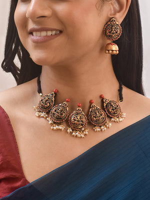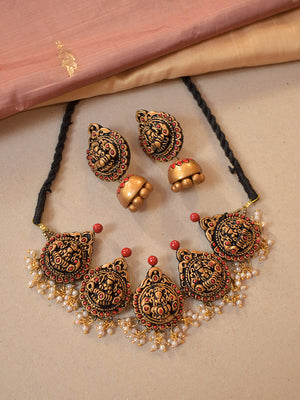 Handcrafted Lakshmi Pendant Terracotta Jewellery Set in Antique Gold, Red & Pearl Droplets