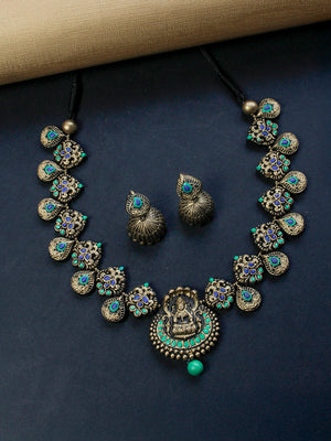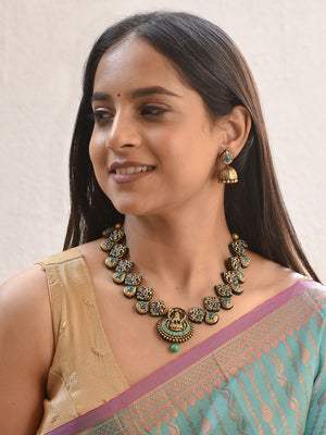 Handcrafted Lakshmi Pendant Terracotta Jewellery Set in Blue & Antique Gold