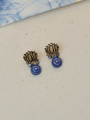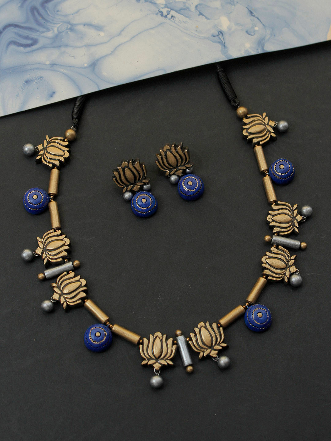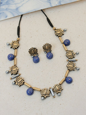 Handcrafted Lotus Pendant Terracotta Jewellery Set in Blue & Antique Gold