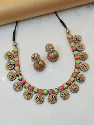 Handcrafted Peacock Motif Terracotta Jewellery Set in Red, Green and Antique Gold