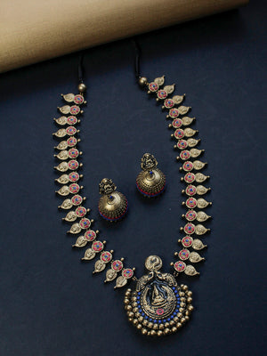 Handcrafted Temple Design Terracotta Jewellery Set in Red, Blue and Antique Gold