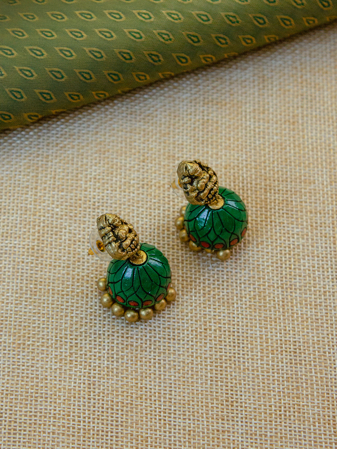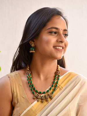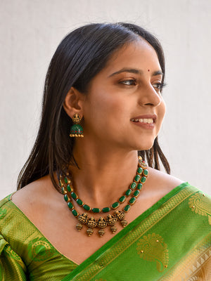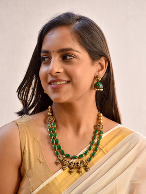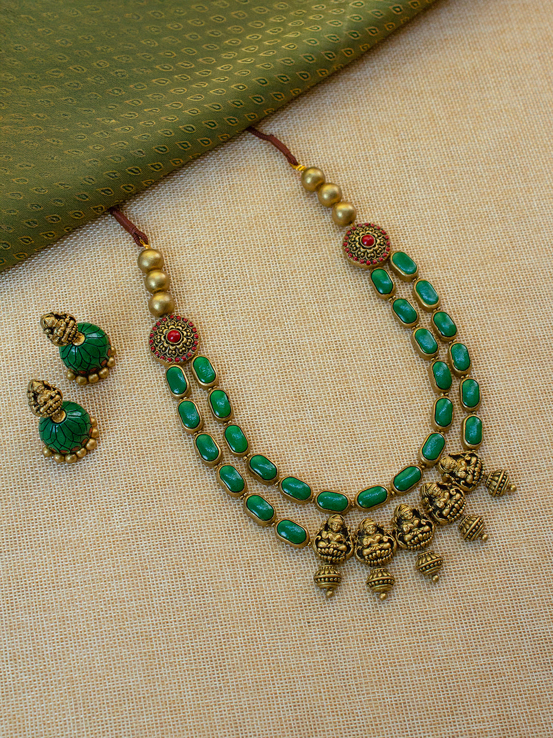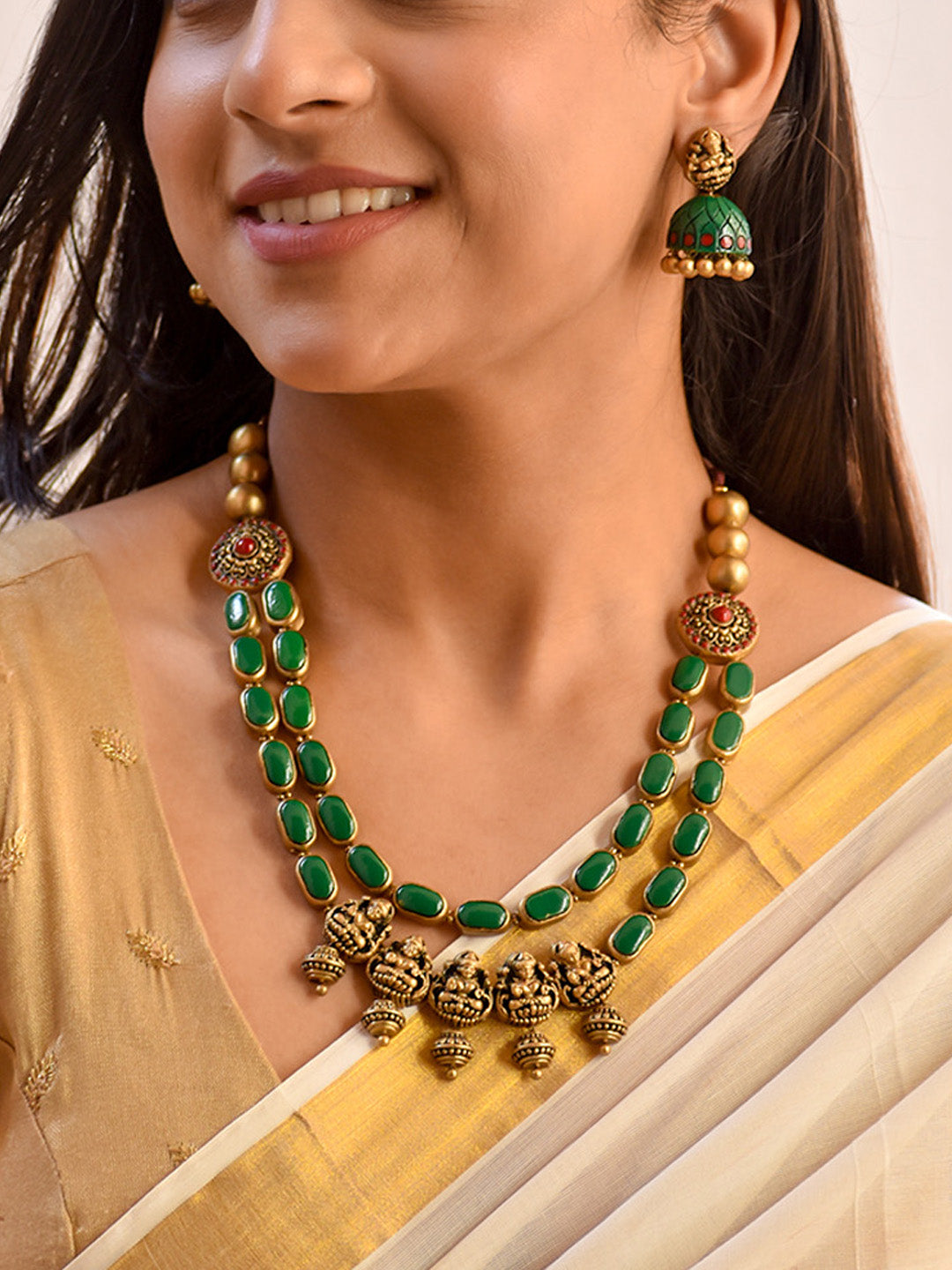 Handcrafted Temple Two Layer Terracotta Jewellery Set in Emerald Green, Ruby Red & Antique Gold