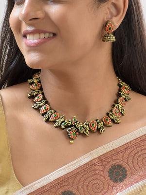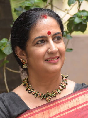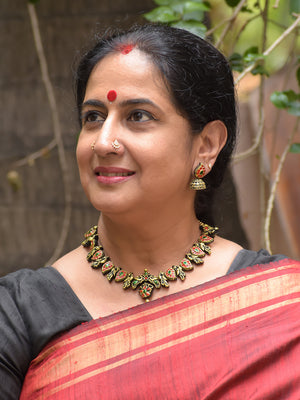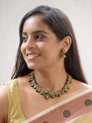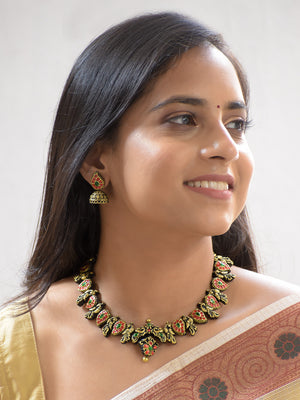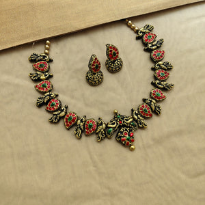 Handcrafted Terracotta Antique Gold Mango Motif Peacock Design Necklace Set in Red and Green