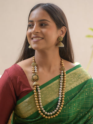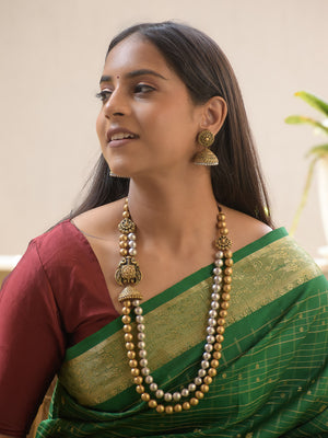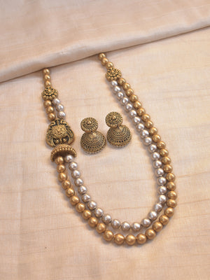 Sundari - Handcrafted Terracotta Dual-Tone Beaded Mogappu Necklace Set with Floral Pendant and Antique Finish Earrings