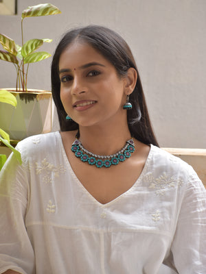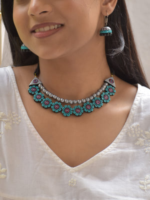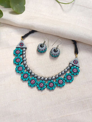 Handcrafted Terracotta Floral Bead Necklace Set – Blue Red & Silver Accents Earrings