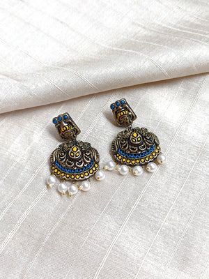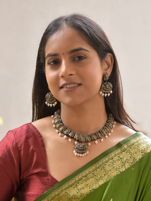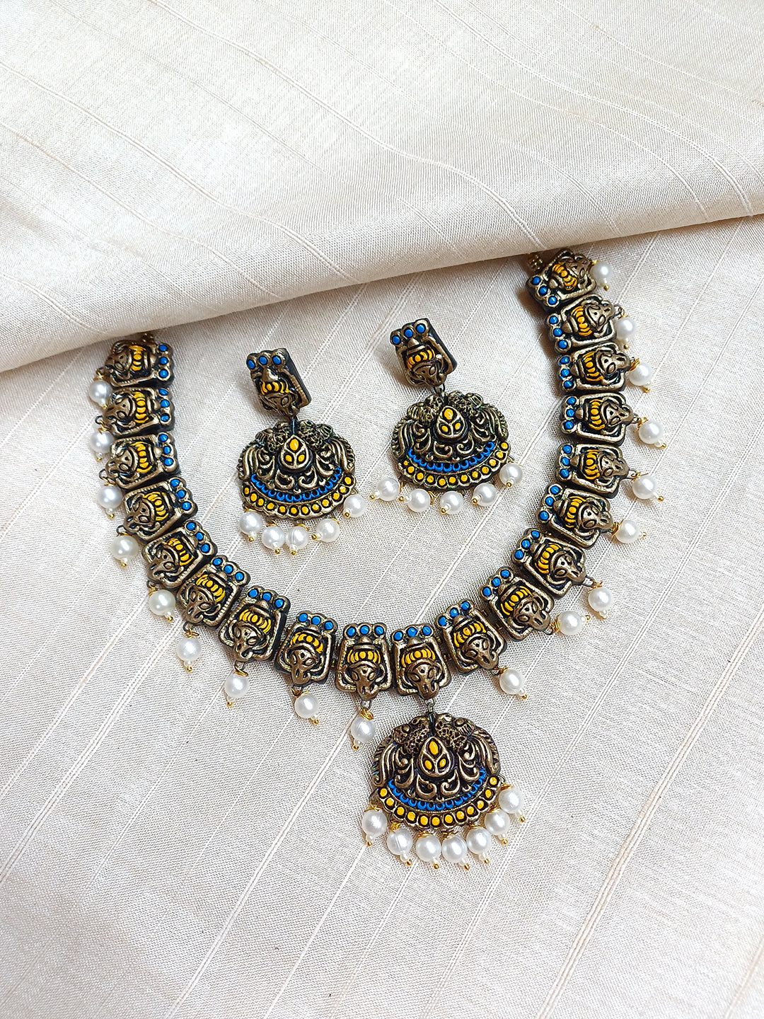 Handcrafted Terracotta Ganesha Necklace Set with Antique Gold & Blue Detailing, Pearl Drops, and Jhumka Earrings