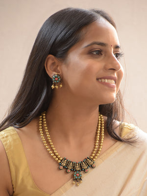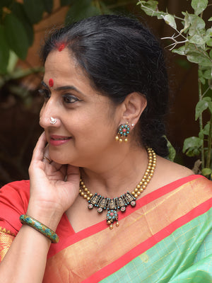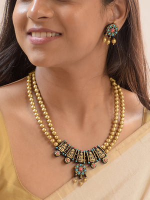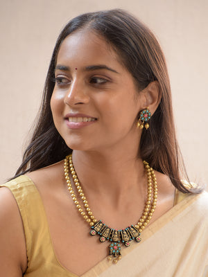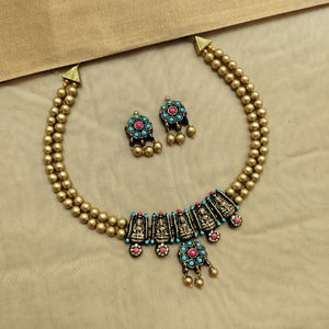 Handcrafted Terracotta Lakshmi Design Choker Necklace Set in Antique Gold, Blue and Red
