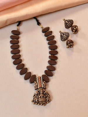Handcrafted Terracotta Lakshmi Pendant Necklace Set with Gold Bead Earrings