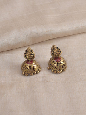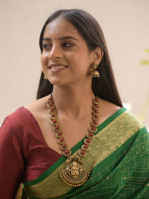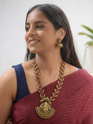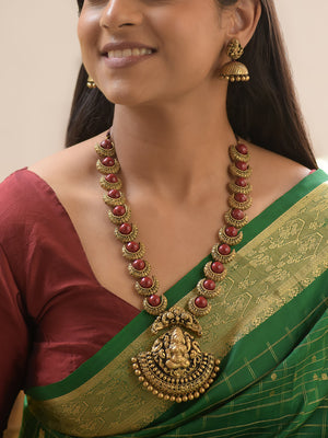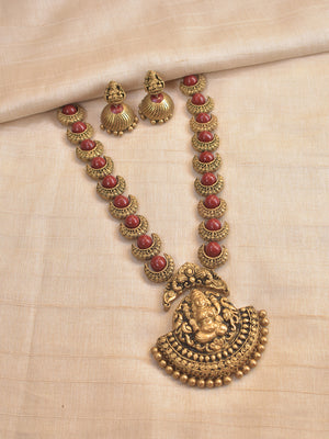 Chandrika - Handcrafted Terracotta Lakshmi Pendant Necklace Set with Red Crescent Beads and Antique Finish Earrings