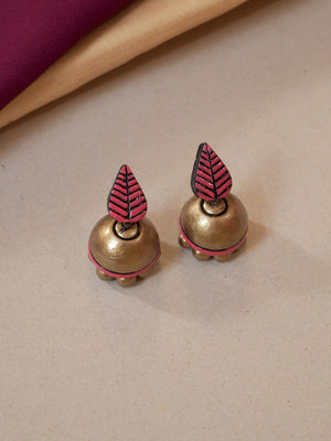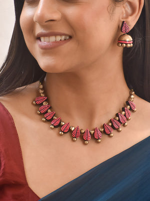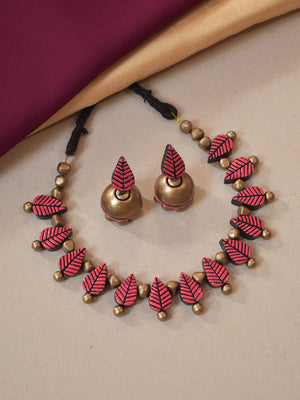 Handcrafted Terracotta Leaf Necklace Set with Red and Golden Bead Earrings