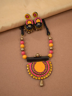 Home Handcrafted Terracotta Necklace Set with Yellow, Pink, Orange, Black Tribal Design with Matching Jhumka Earrings