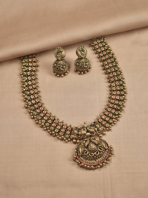 Priyaasi - Handcrafted Terracotta Peacock Motif Necklace Set with Colors Detailing and Antique Finish Earrings