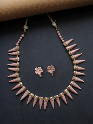Handcrafter Spiked Pink Necklace with Floral Earrings Set