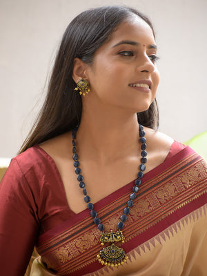 Handmade Terracotta Blue Beaded Peacock Pendant Necklace Set with Stud Earrings in Antique Gold