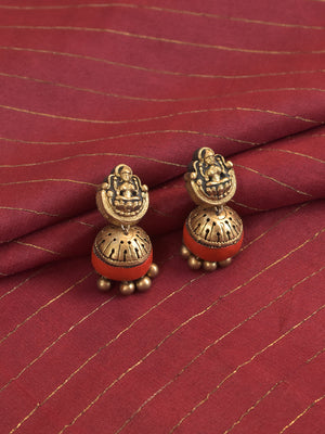 Lakshmira - Handmade Terracotta Lakshmi Pendant Necklace Set in Antique Gold with Red & Green Accents and Matching Earrings