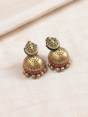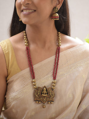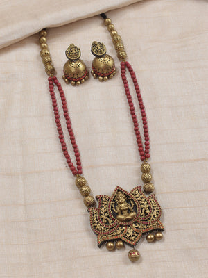 Padmalaya - Handmade Terracotta Lakshmi Pendant Necklace Set with Red Beads and Antique Lotus Frame and Matching Earrings