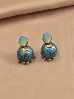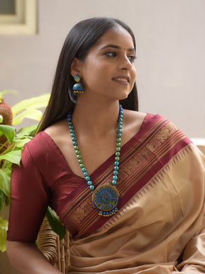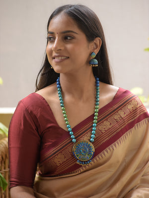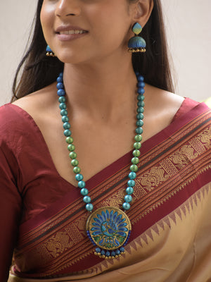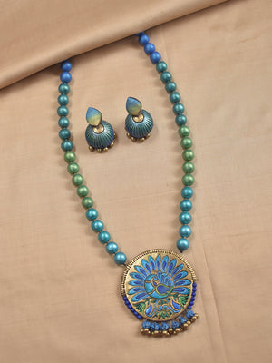Neela - Handmade Terracotta Peacock Motif Necklace Set – Blue & Green Beads and Matching Earrings