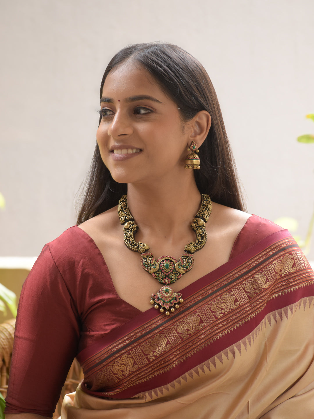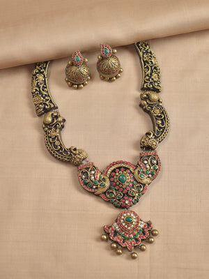 Mayurangana - Handmade Terracotta Peacock Necklace Set with Red-Green Stones and Antique Floral Engraving Earrings