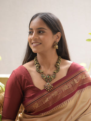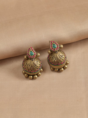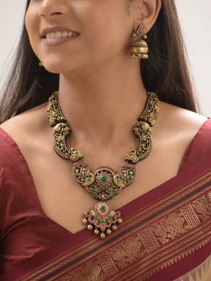 Home Mayurangana - Handmade Terracotta Peacock Necklace Set with Red-Green Stones and Antique Floral Engraving Earrings