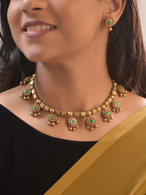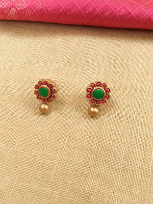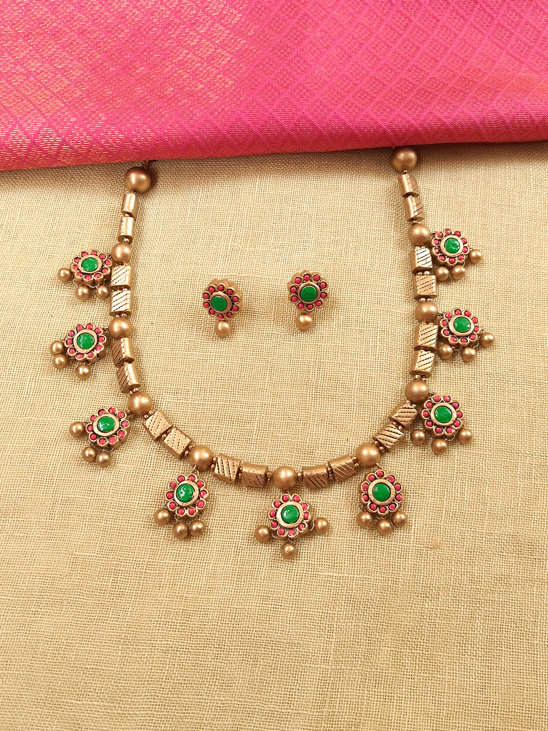 Haripushpa – Handmade Terracotta Floral Necklace Set with Green Center Stones, Pink Petals & Antique Gold Bead Drops