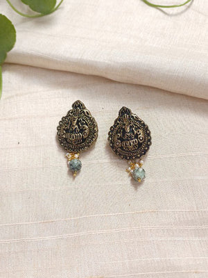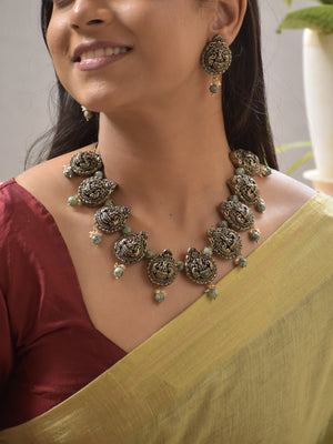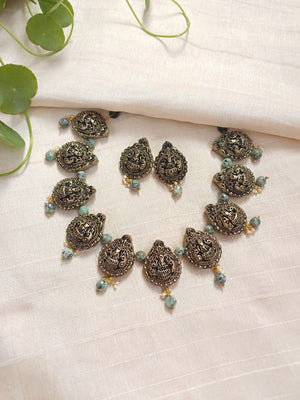 Lakshmi Motifs Terracotta Necklace Set with Green Beads – Antique Gold Finish Stud Earrings