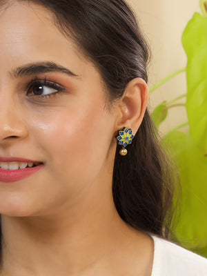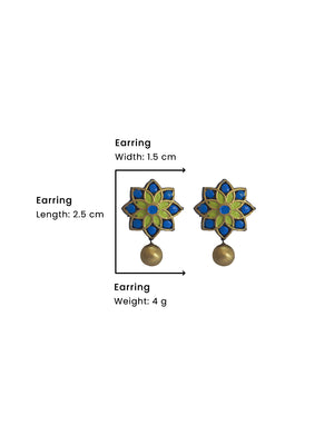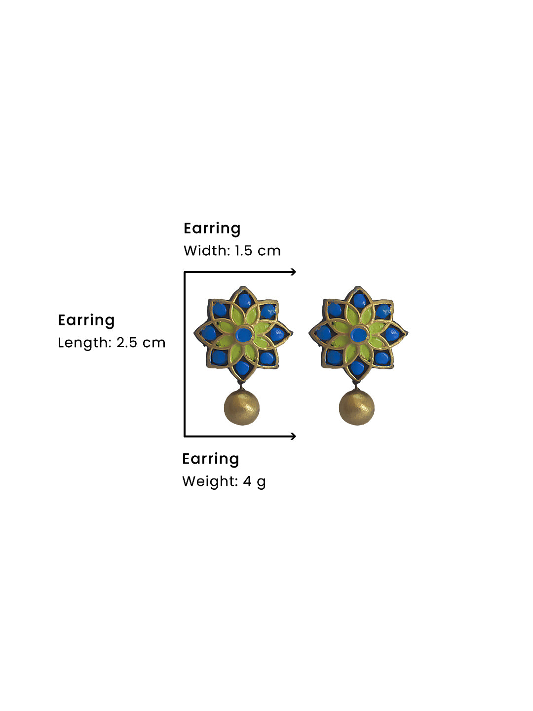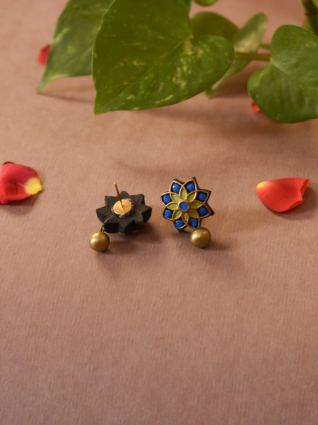Lime Green Blue Antique Gold Floral Mandala Work Handmade Terracotta Stud Earrings
