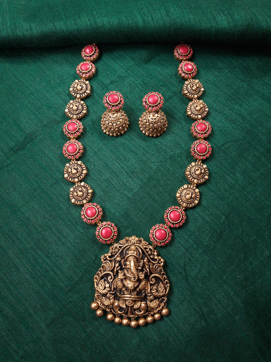 Lord Ganesha Terracotta Temple Necklace Set With Jhumkas