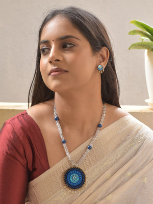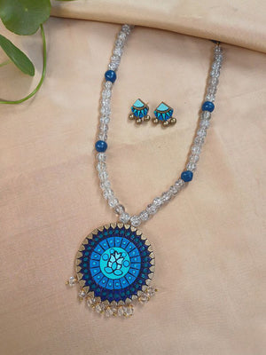 Mandala Bloom Terracotta Necklace Set with Lotus Motif – Blue & Crystal Beaded Elegance Stud Earrings