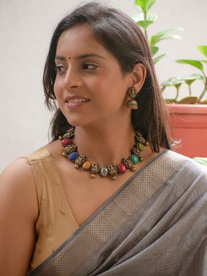 Navaratna Design - Auspicious Navaratna 9 Colors, Premium Antique Gold Finish, Ganesha design, Handmade Terracotta Necklace Set