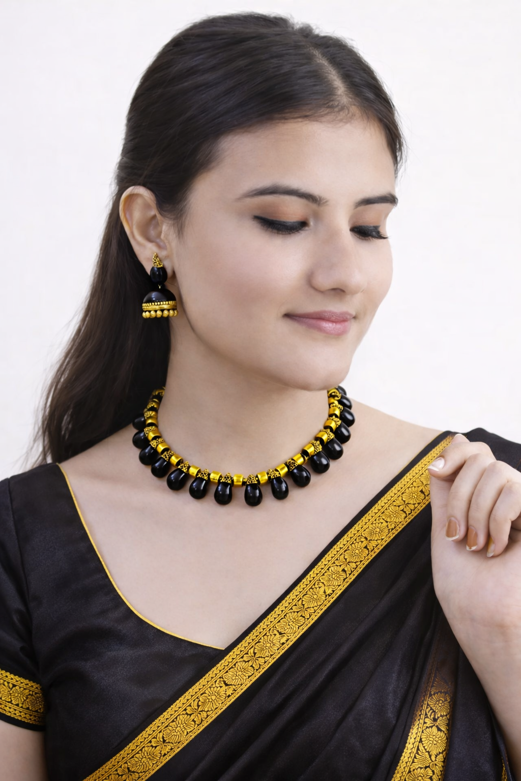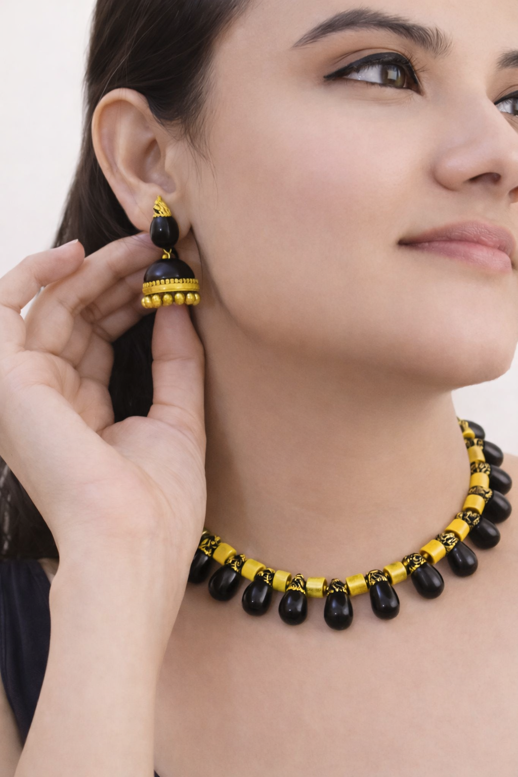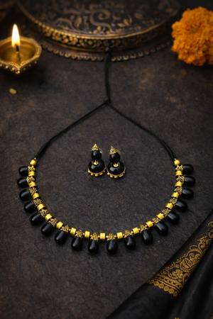Obsidian Grace 🌼 — Tear Drop Design Handmade Terracotta Yellow/Obsidian Black Colour Choker Necklace Set