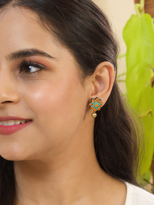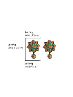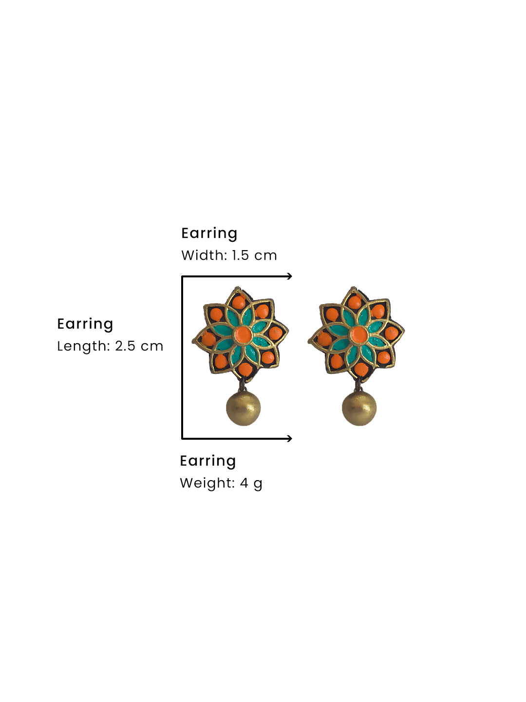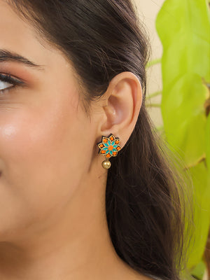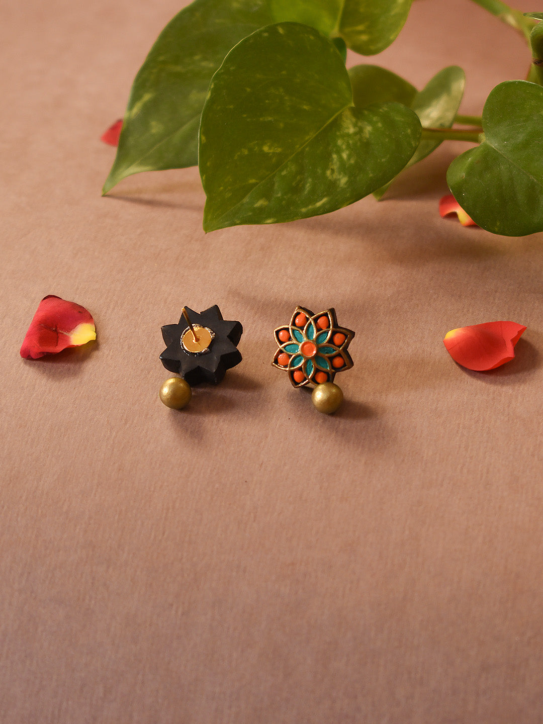 Orange Aqua Blue Antique Gold Floral Mandala Work Handmade Terracotta Stud Earrings