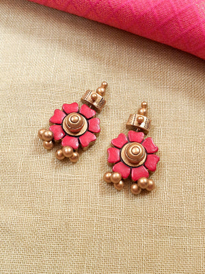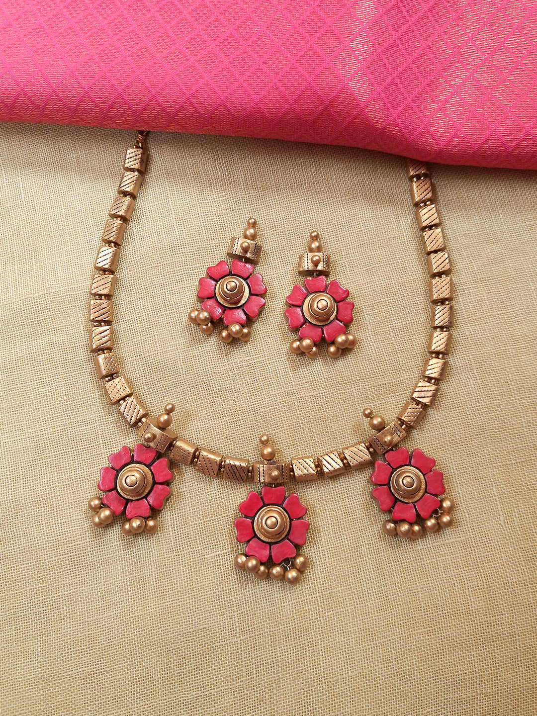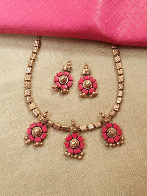 Pankhurika – Handmade Terracotta Floral Necklace Set with Pink Petal Motifs and Antique Gold Bead Drops
