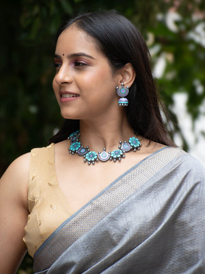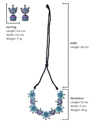 Pastel Blue Lavander and Silver Floral Design Contemporary Style Handmade Terracotta Necklace Set