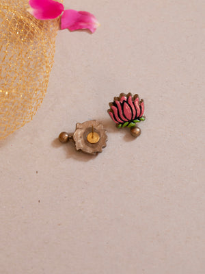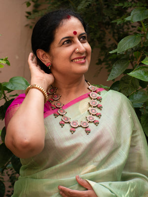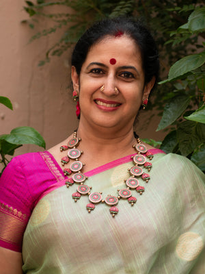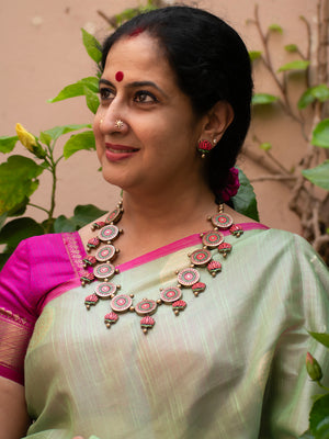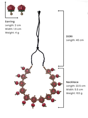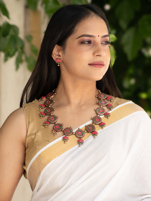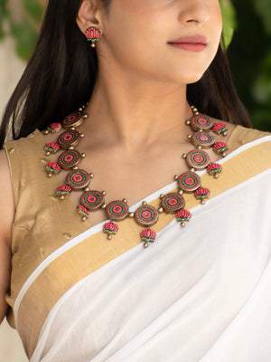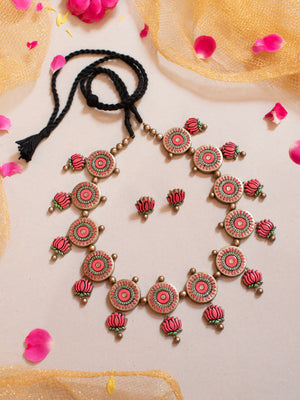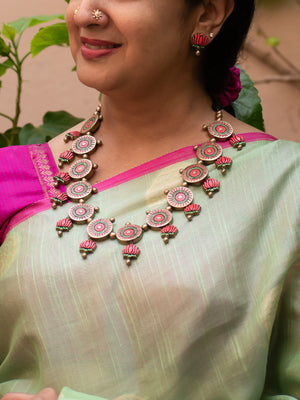 Pink Green and Gold Lotus Design Circular Mandala Art Work Handmade Terracotta Necklace Set