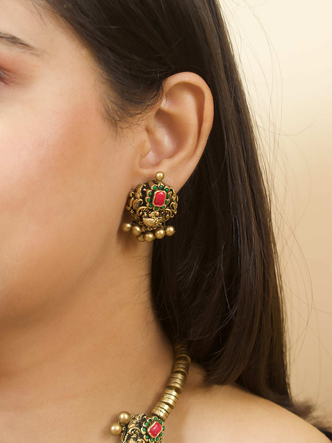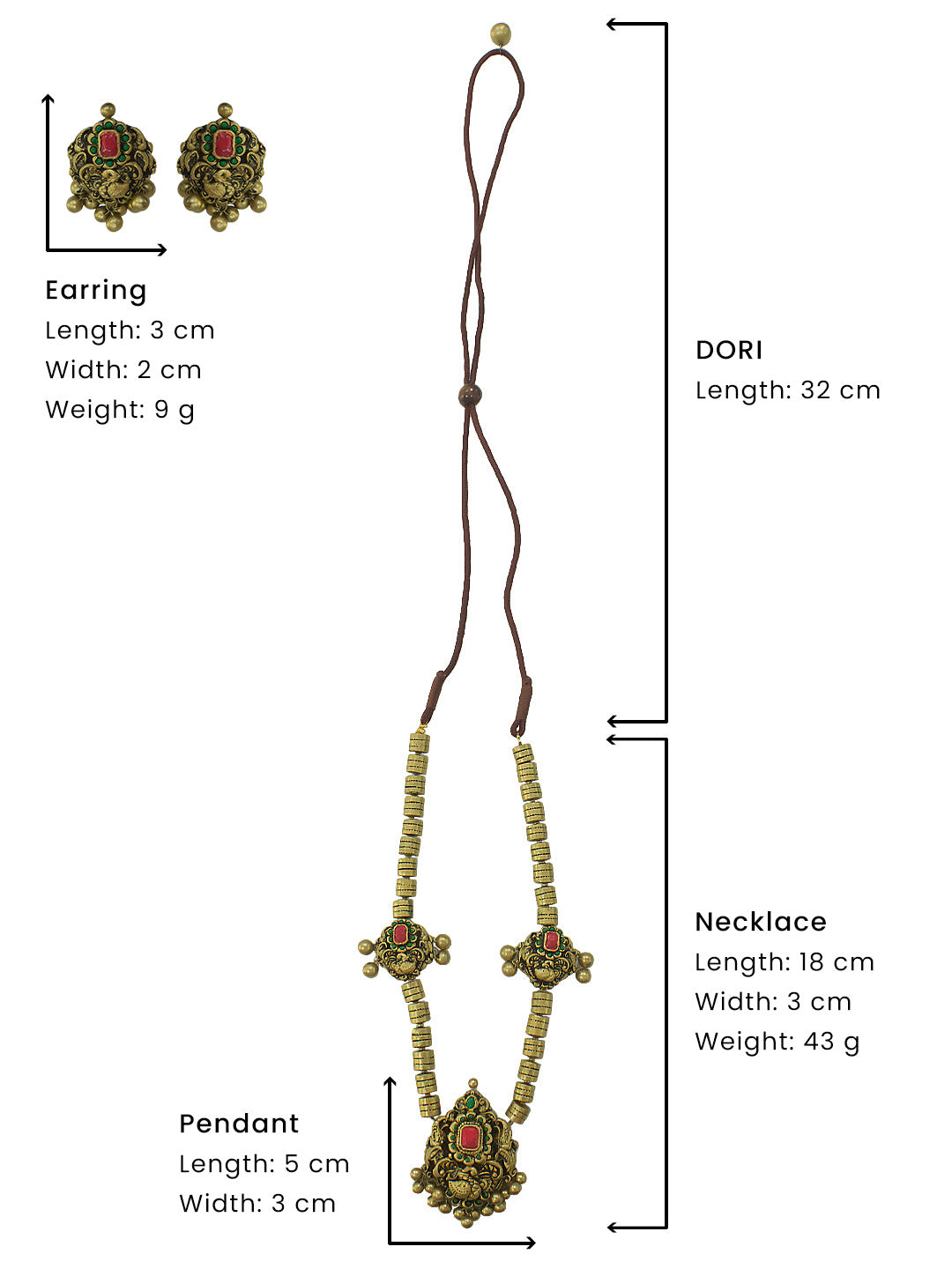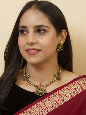 Pink Green Antique Gold Cylindrical Tube Design Peacock Handmade Terracotta Necklace Set