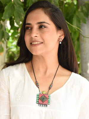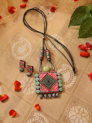 Pink Orange Pastel Shades of Green Square Pendant Spiral Rhombus Handmade Terracotta Necklace Set