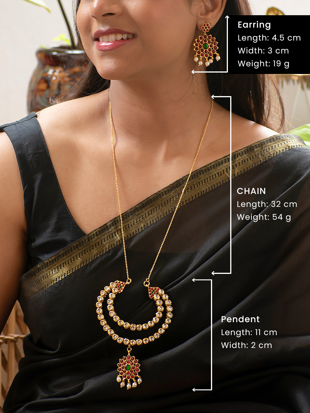 Premium Gold Finish Kundan Stones Red and Green Kemp Stones Temple Necklace Set with Gold Chain