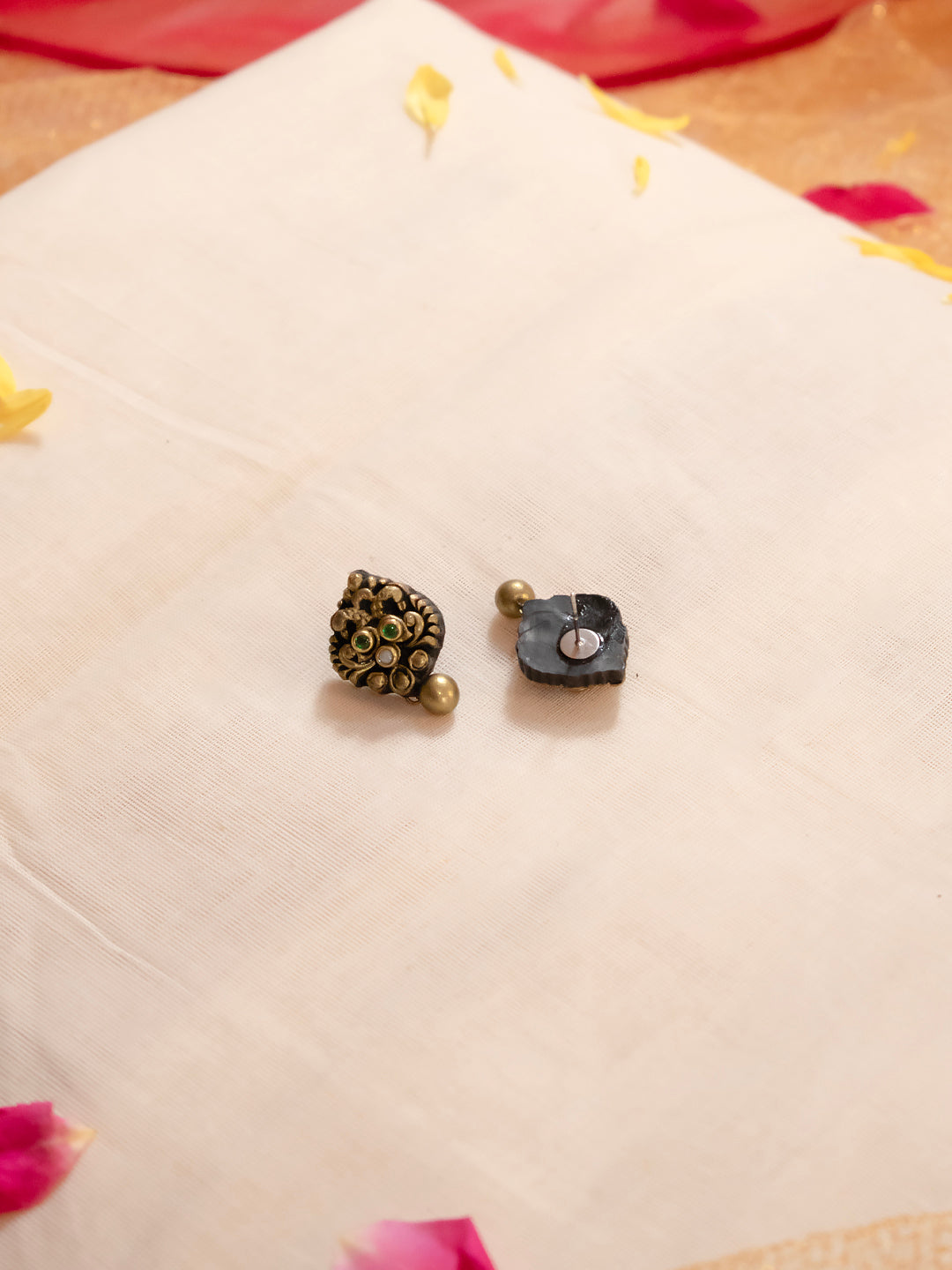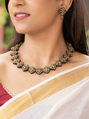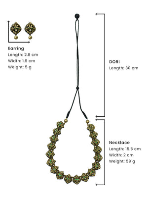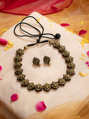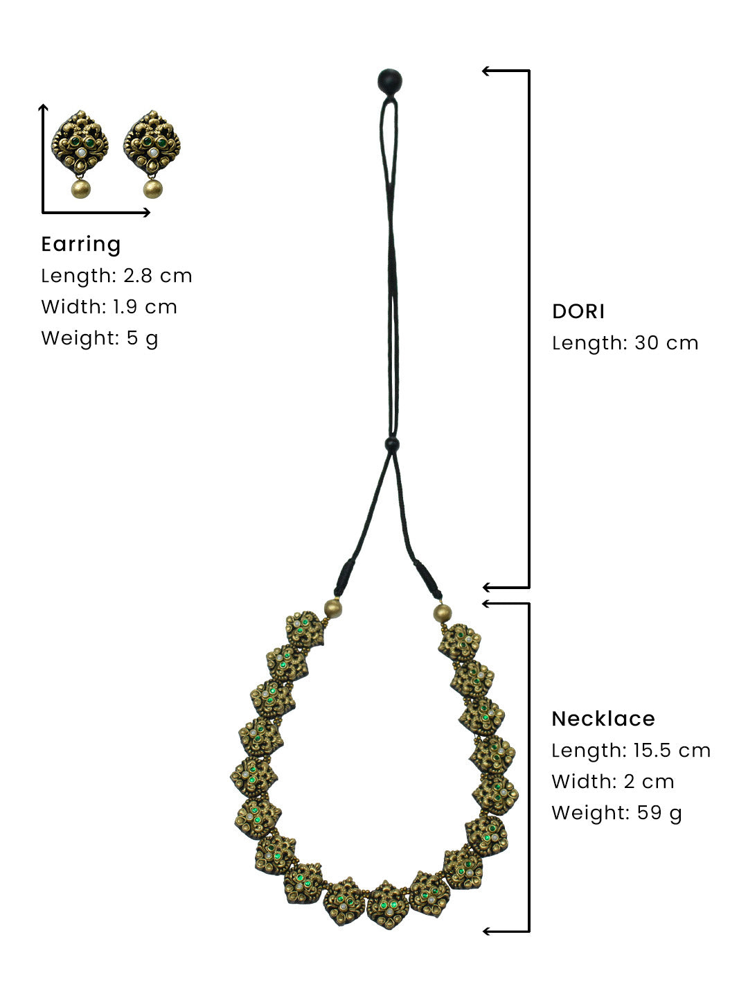 Rhombus Design Antique Gold Green White Kundan Stone Handmade Terracotta Necklace Set