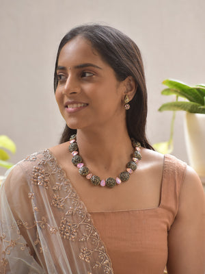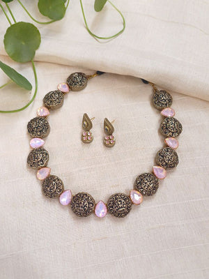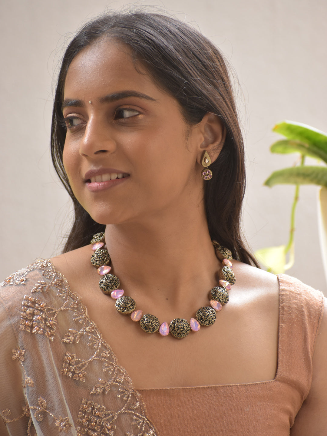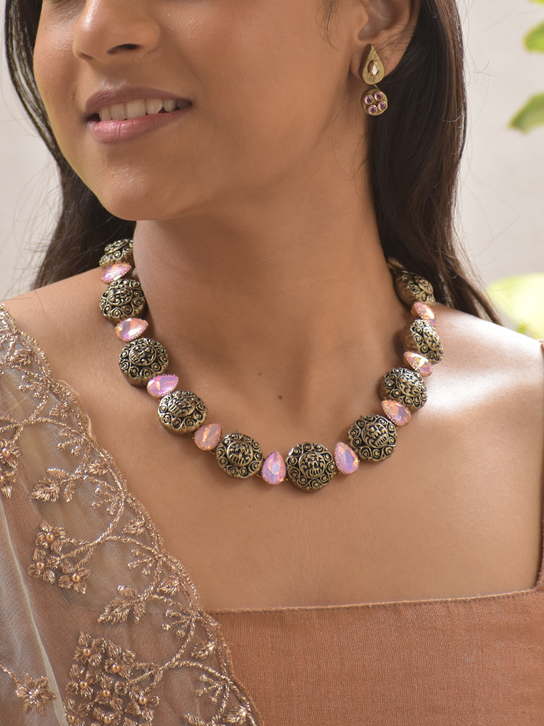 Rose Radiance Lakshmi Motifs Terracotta Necklace Set with Antique Gold & Pink Crystal Teardrops Stud Earrings