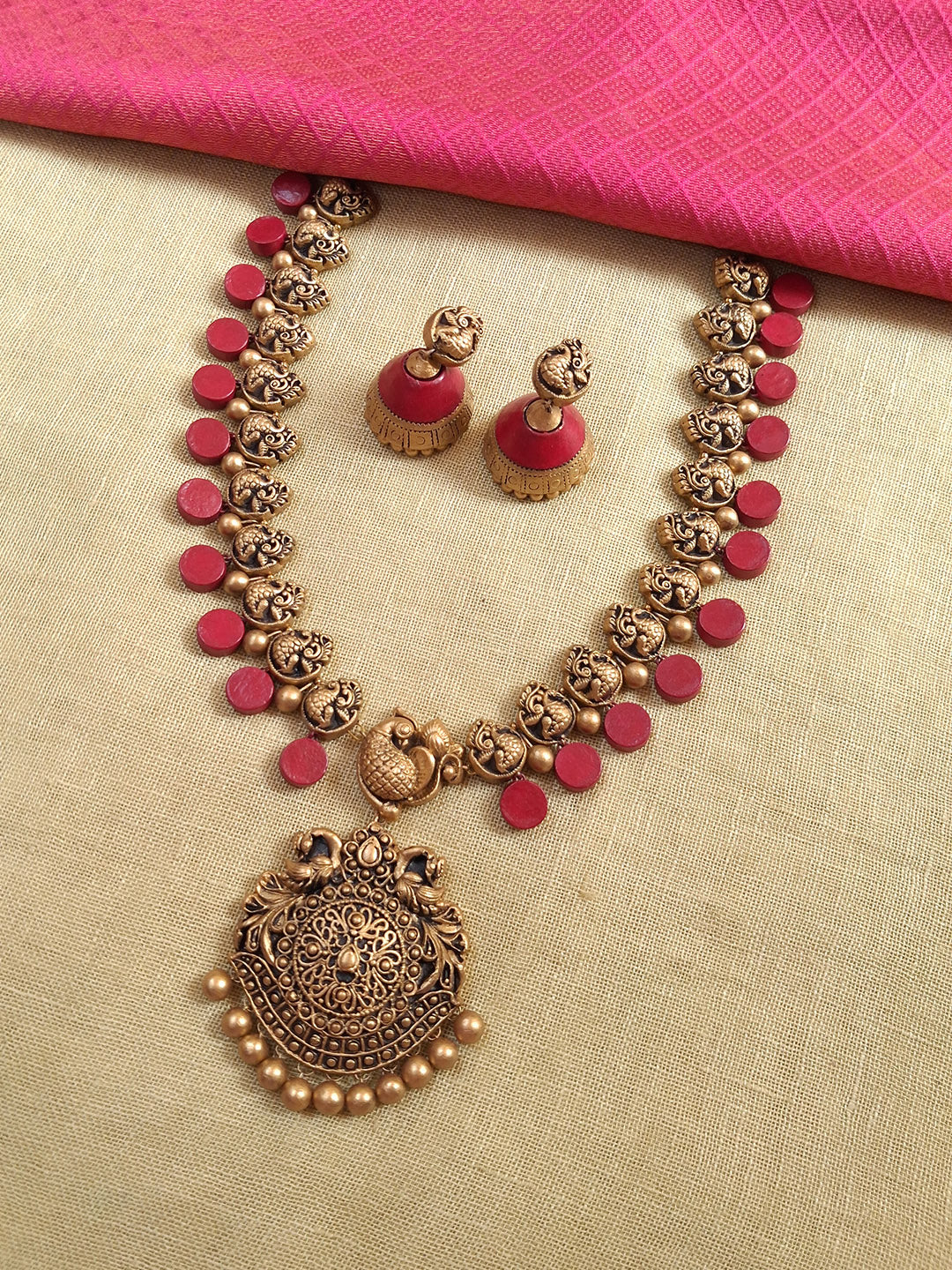 Rudrabali – Handmade Terracotta Temple Necklace Set with Red Disc Beads and Antique Gold Engraved Pendant