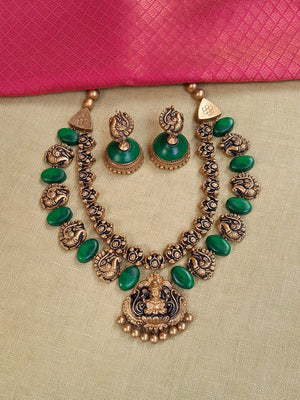 Shrilakshya – Handmade Terracotta Lakshmi Necklace Set with Antique Gold Motifs and Emerald-Green Beads