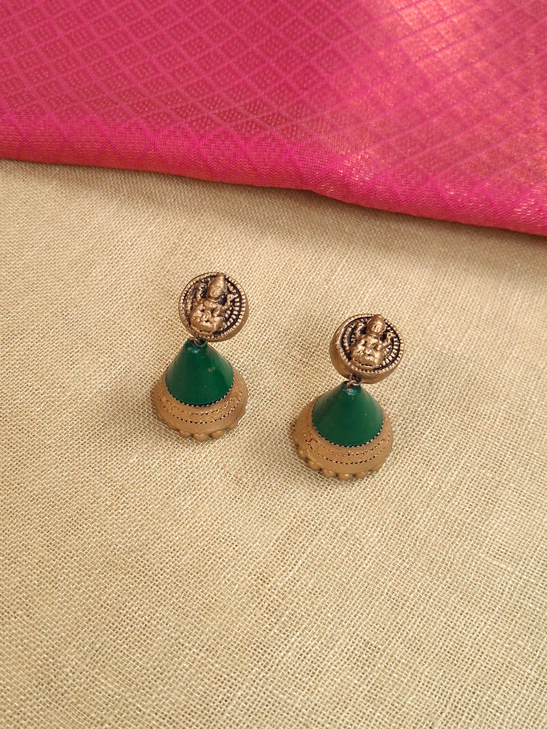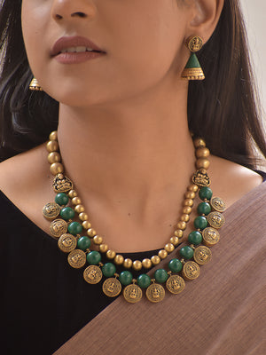 Home Shringar – Handmade Terracotta Lakshmi Coin Necklace Set with Green Beads and Antique Temple Jhumka Earrings