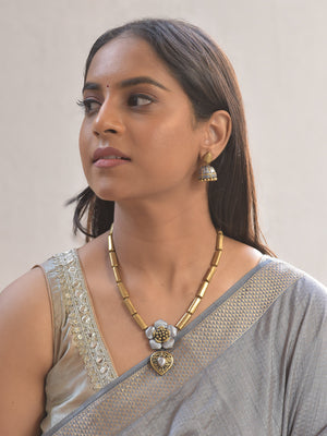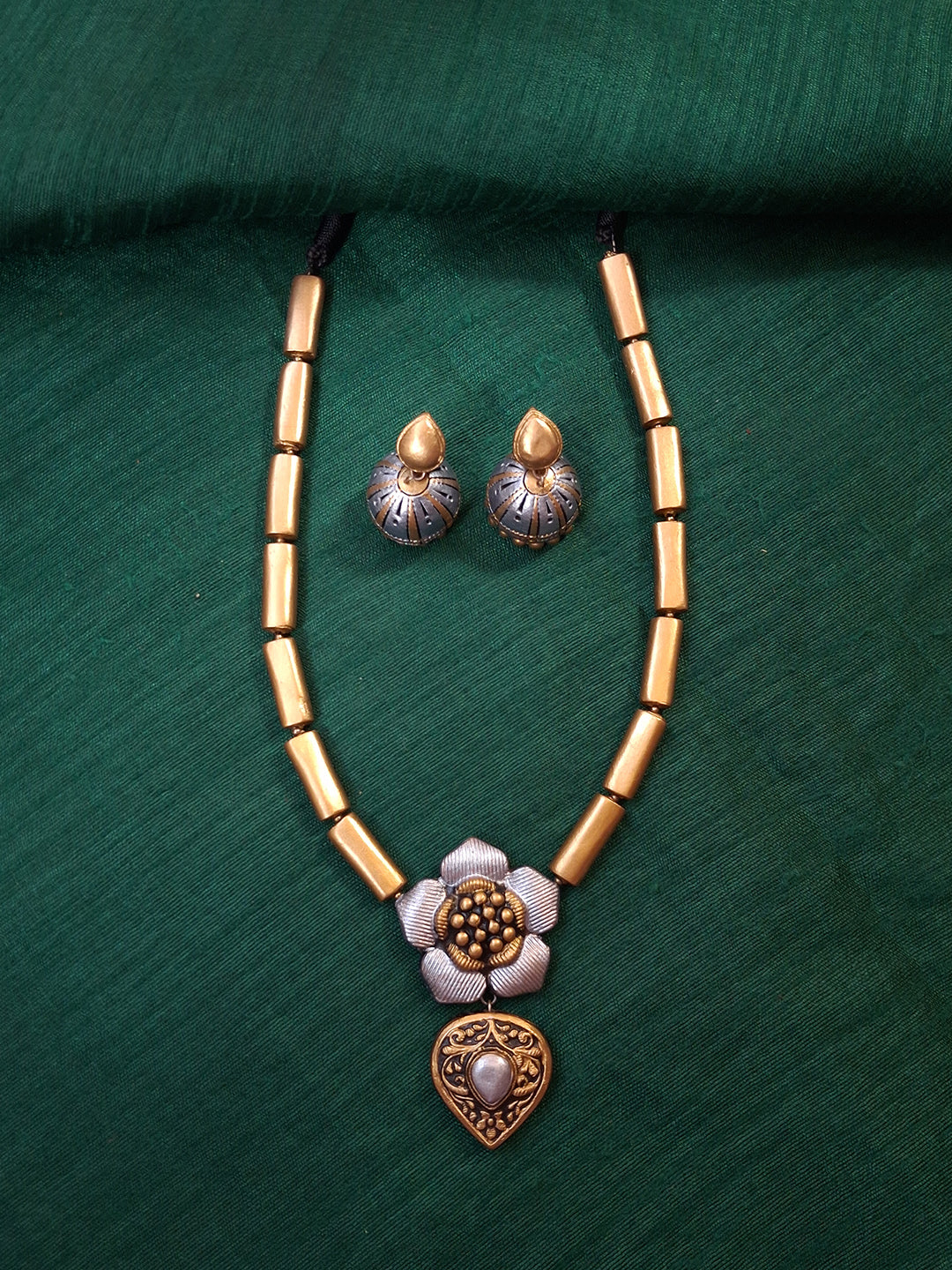 Rajata Pushpa Lata — Silver Blossom Charm Terracotta Necklace Set With Jhumkas
