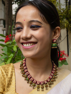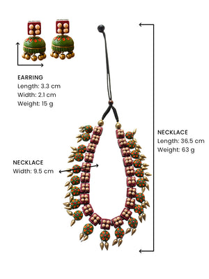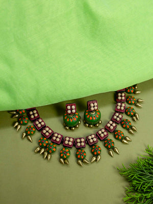 Square Design with Floral Hangings Antique Gold Red Green Mauve Orange and Pearl White Handmade Terracotta Necklace Set